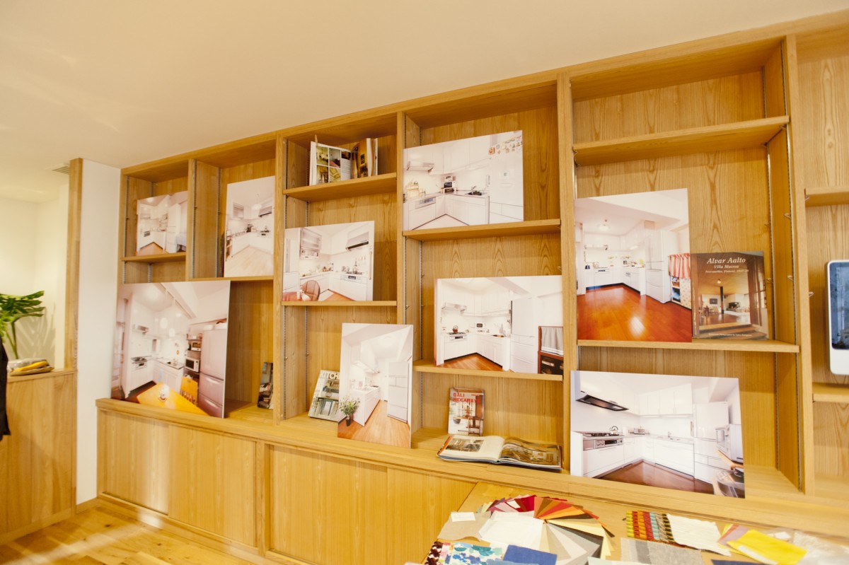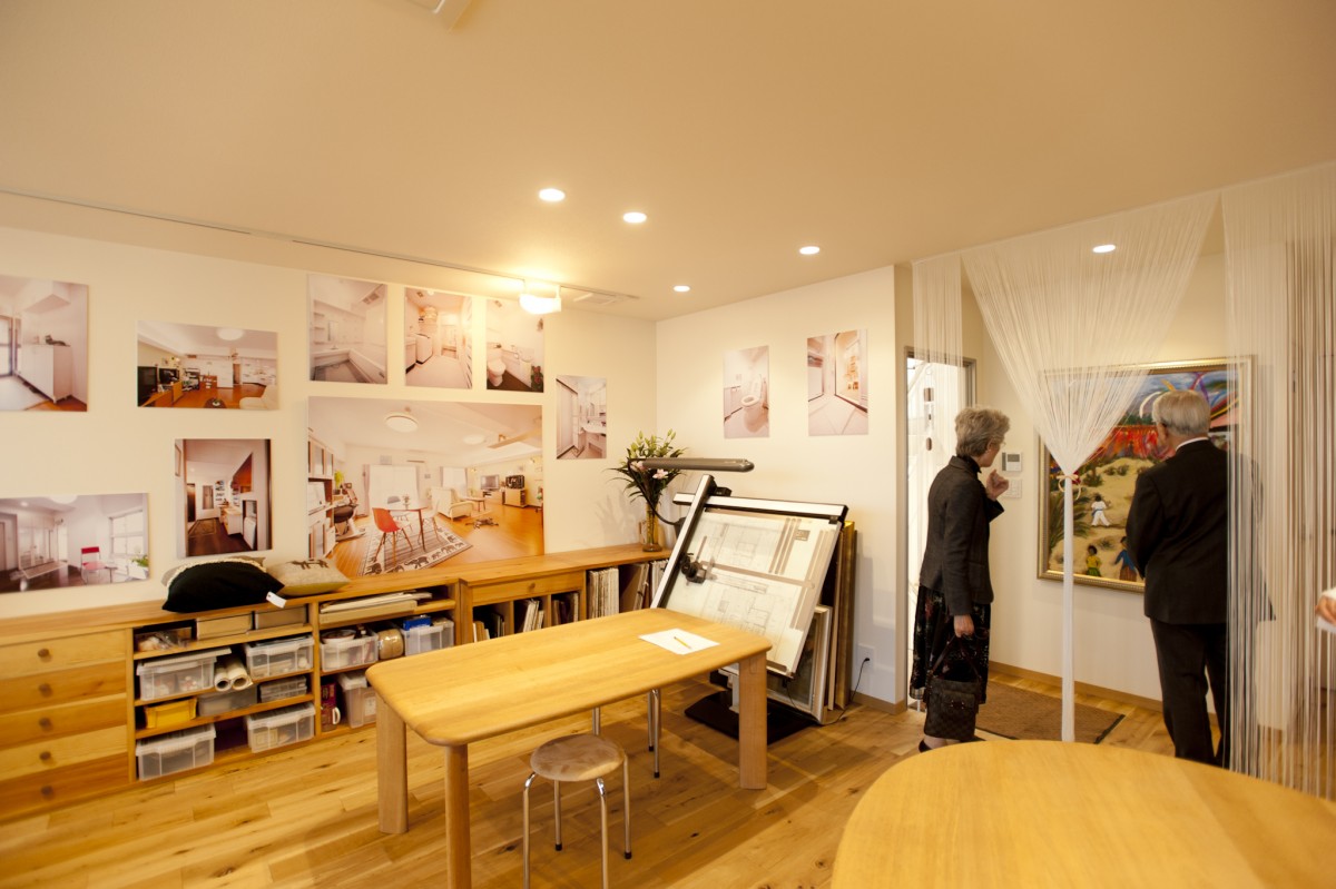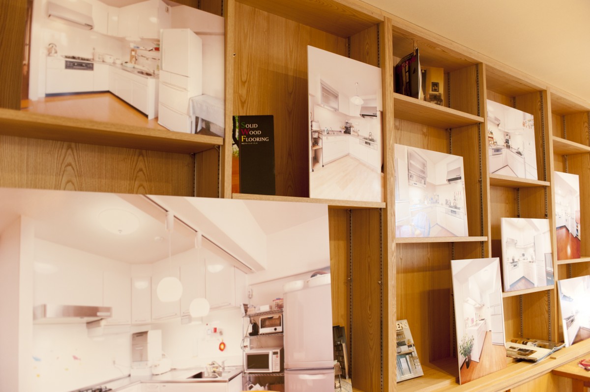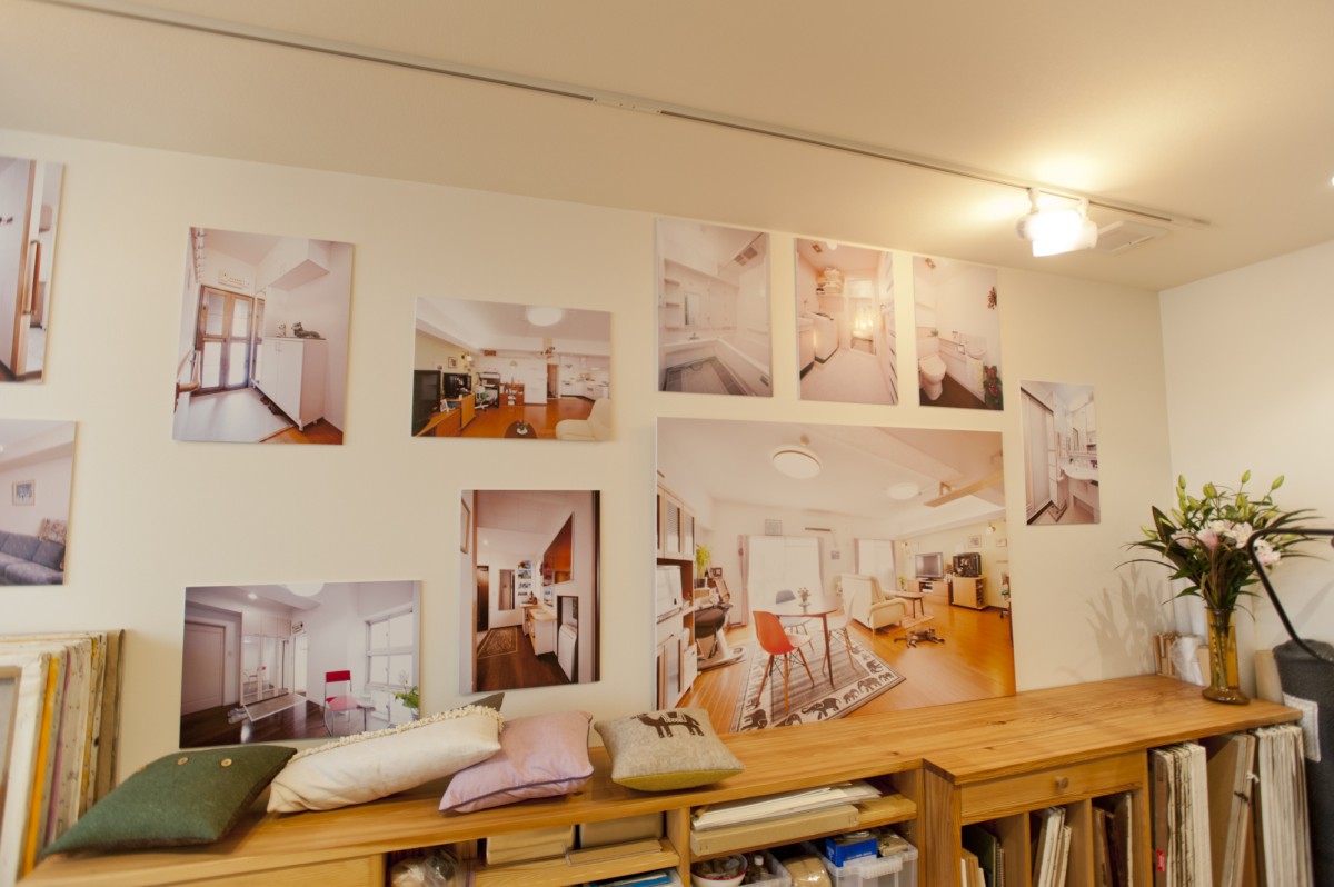 壁にはペタペタ、施工事例を。
