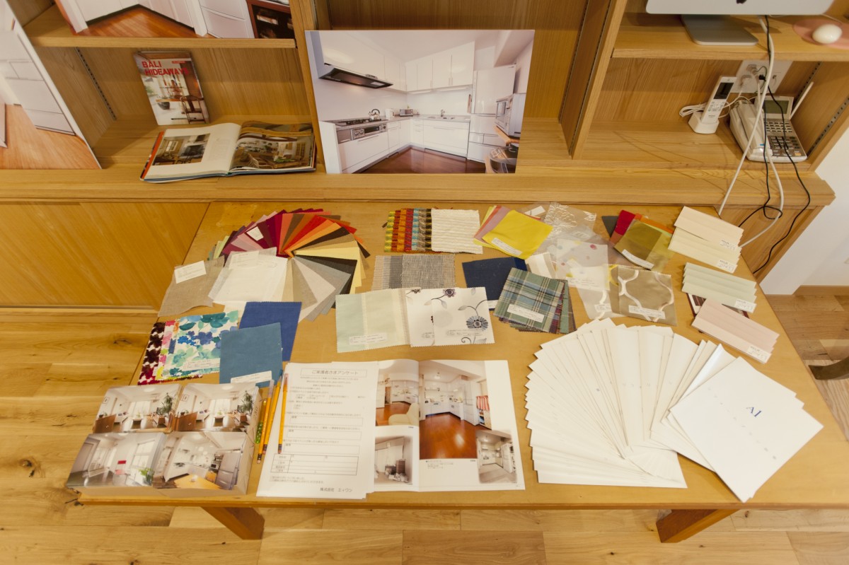 カーテン生地やクロスのサンプル。いろんな色柄があって、何やら楽しそうな雰囲気になりました。