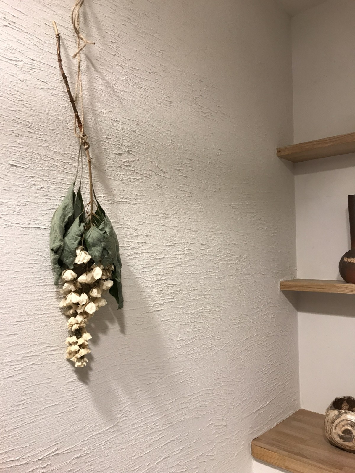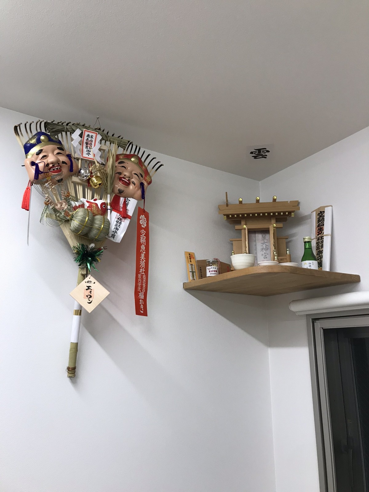 熊手新たに、吉祥方角へ場所を改め、ずっと気になっていた天井の「雲」の字を、氏神さまの空鞘稲生神社の神主さまに ようやく自筆で書いていただきました!