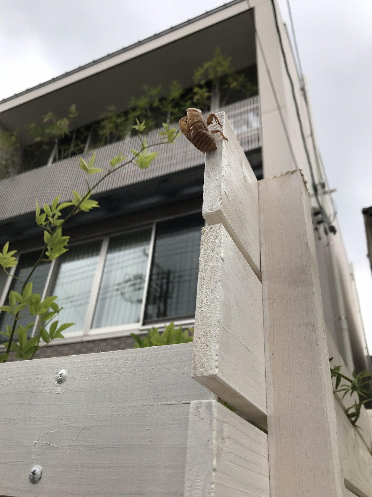 いじらしく、新しく取り付けた木製目隠しにしがみつき、人知れずゆっくり孵化したミンミン君。