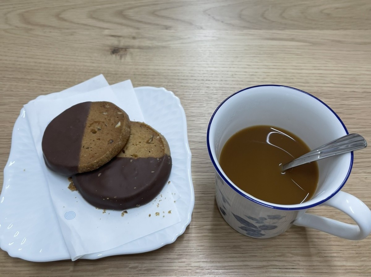 本日の3時のおやつは、チョコかけクッキー(ナッツ入り)でした。